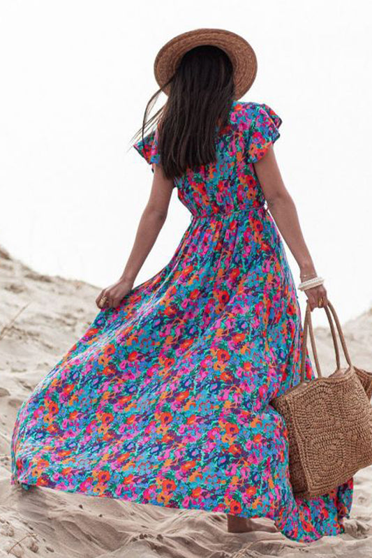 Floral Frill Trim Flounce Sleeve Plunge Maxi Dress