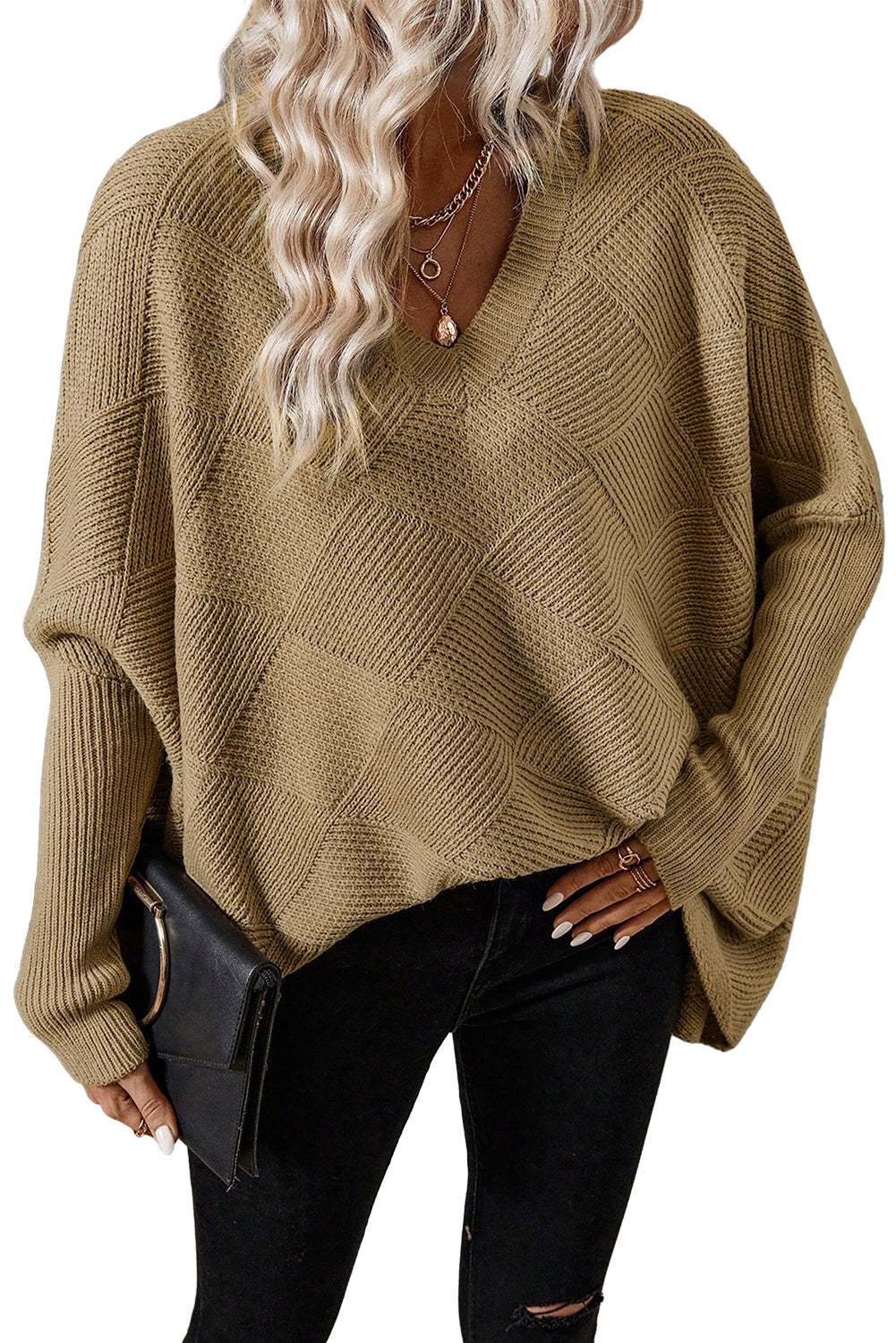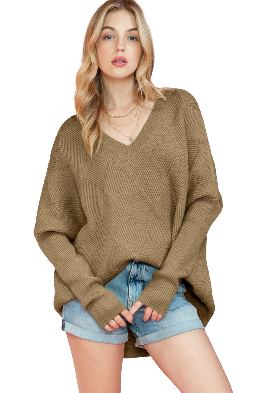 Camel Plain V Neck Batwing Sleeve Oversized Sweater