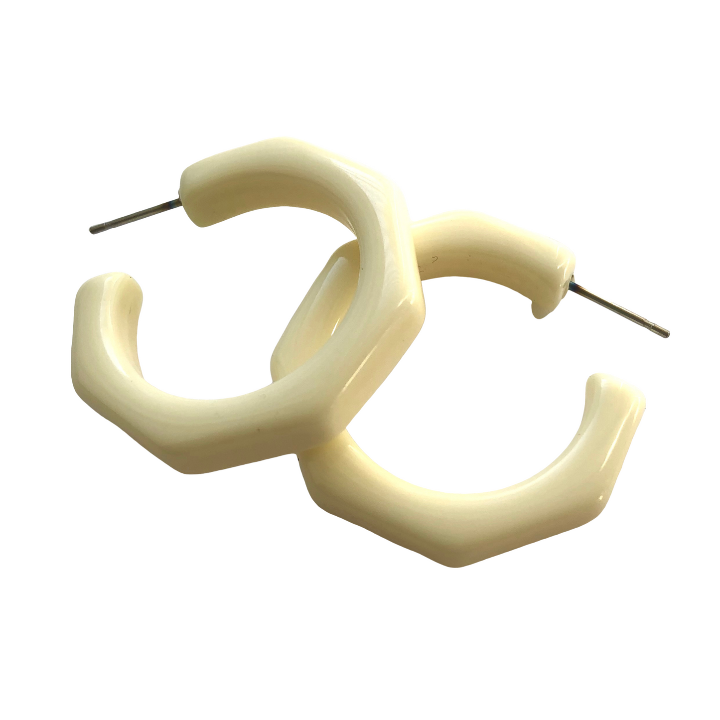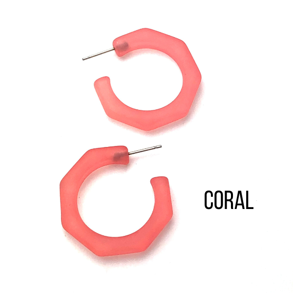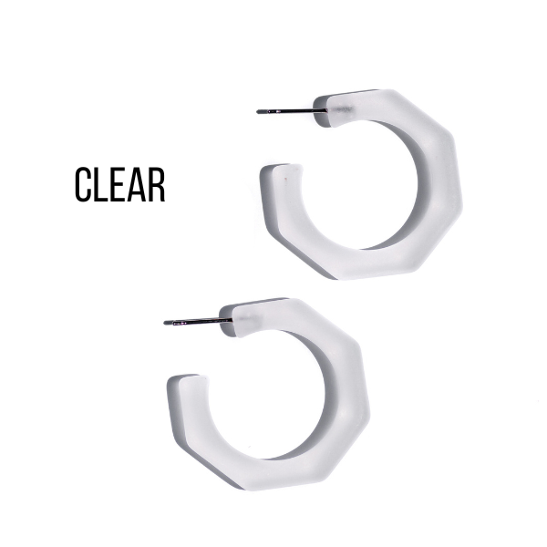 Beveled octagon-shaped hoop earrings in either a frosted or shiny finish, known as the Kay Hoops and made with vintage lucite. Each is 1.25 inches or 30mm in diameter and 6mm thick. Super retro, geometric shape, these are a light-weight earring set by hand with surgical steel. We unearthed these vintage plastics in Europe & finish them off in our AZ studio.