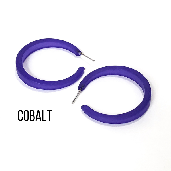 Frosted hoop earrings in a finely shaped & tapered hoop shape that measures approximately 1.5" or 37mm in diameter and 7mm at the widest. This style is known as the Phoenix Hoop. This finish is so super popular and this is one of the most popular colors in the line. The finish is lucite but it resembles sea glass.