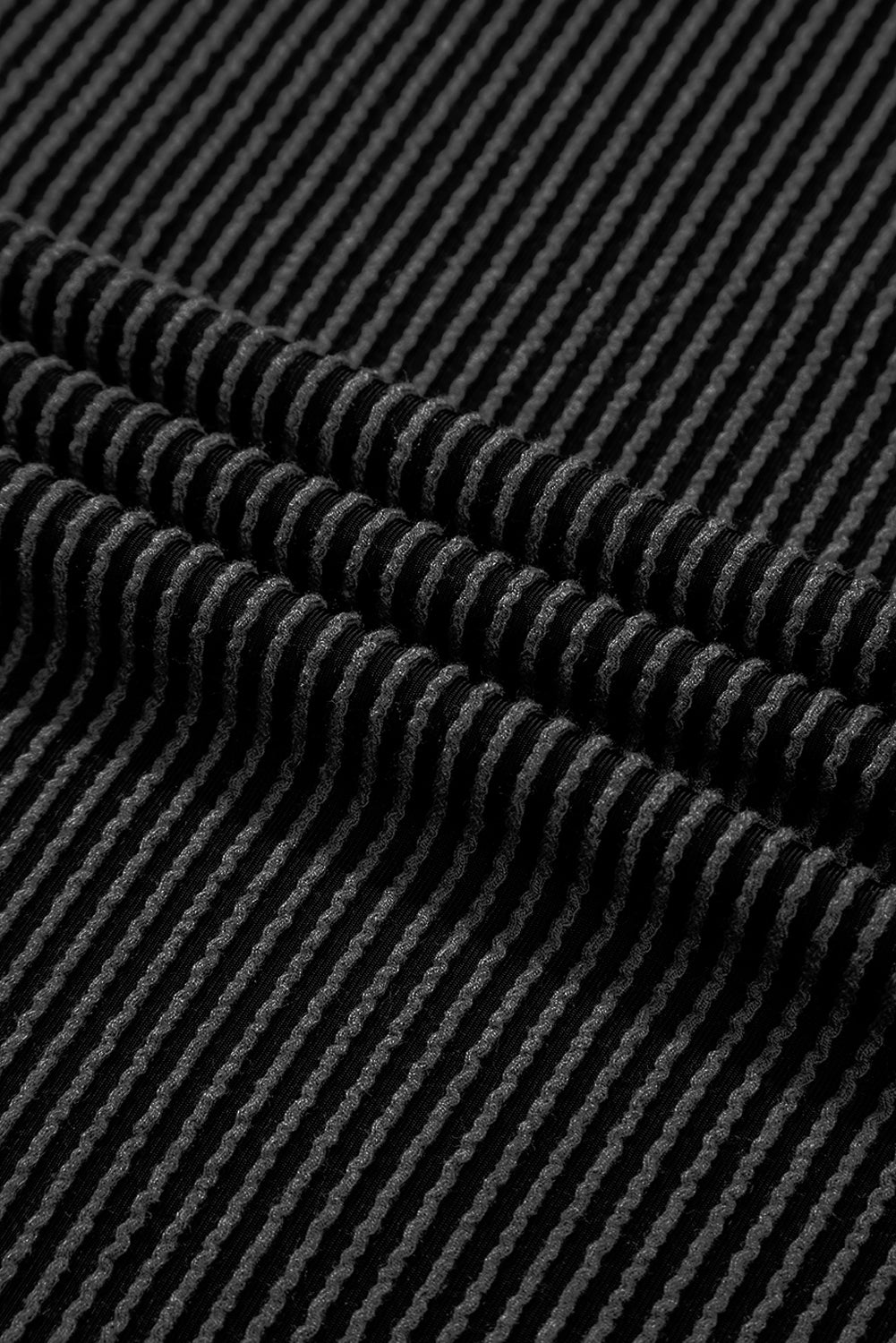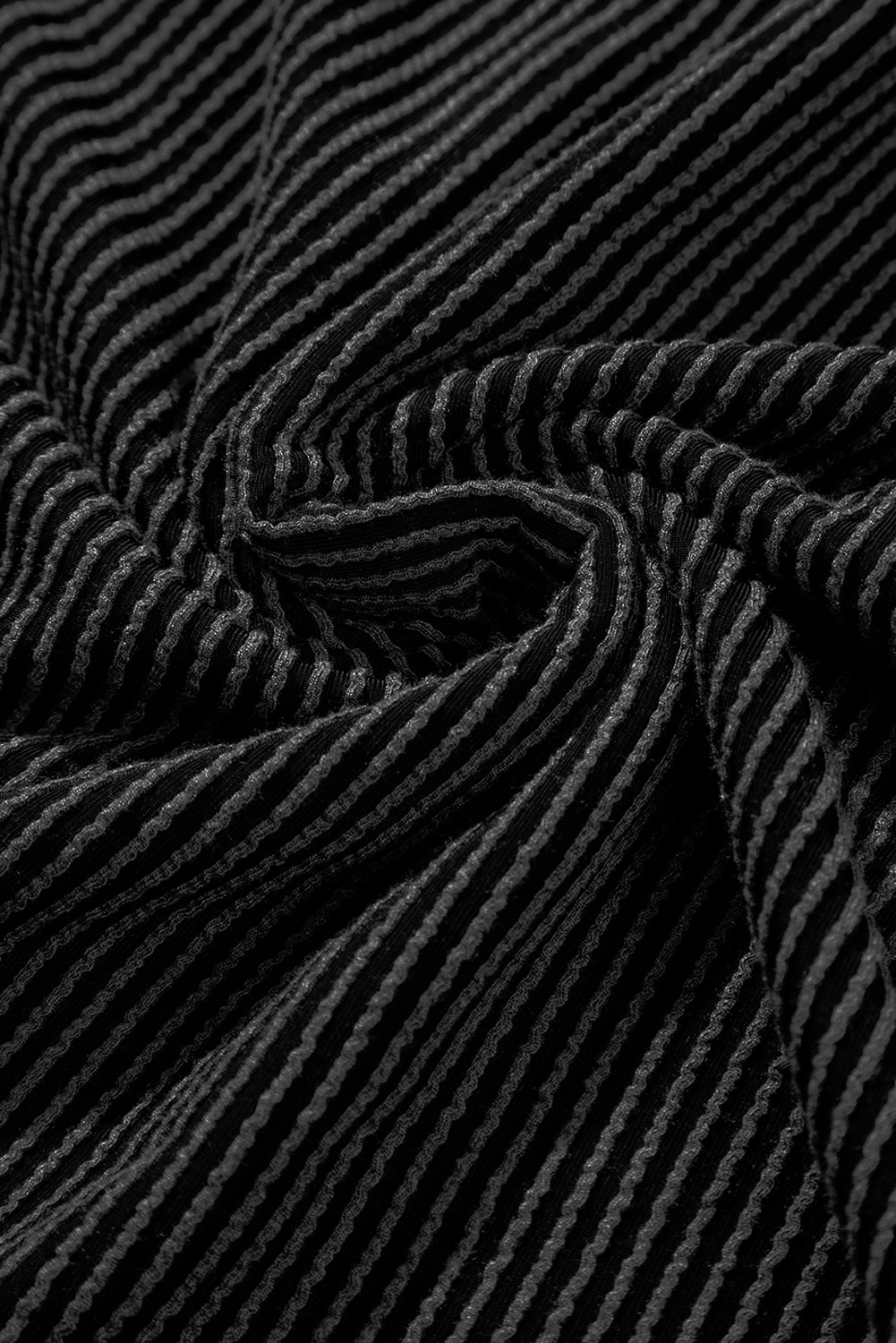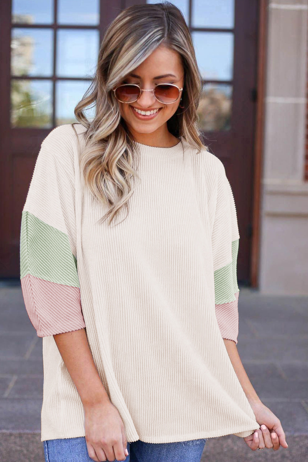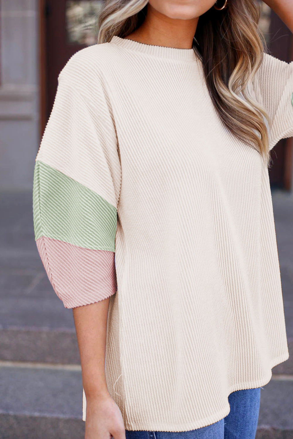 - The top features a colorblock design, with contrasting colors arranged in bold, horizontal stripes across the garment.